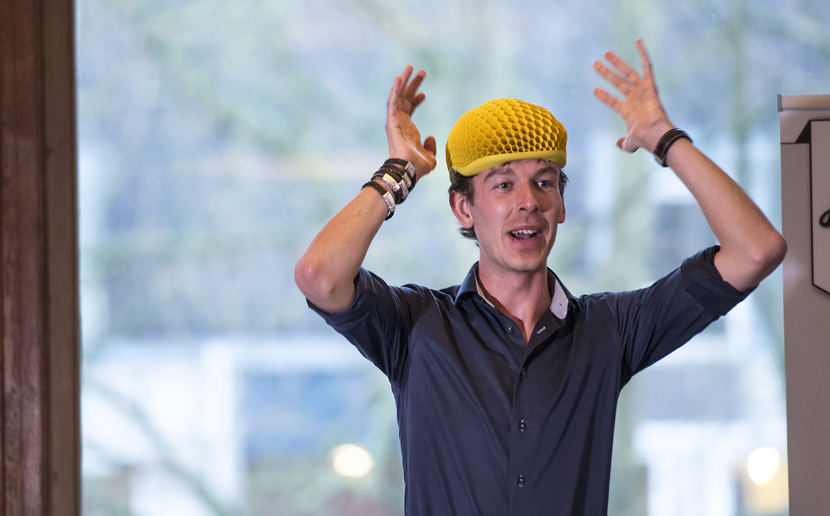 Neil tijdens zijn pitch met een van zijn 3D geprinte producten
